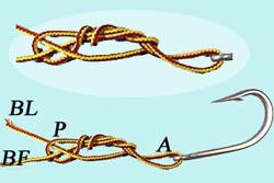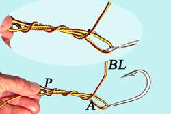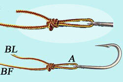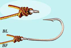 Puis en tirant sur le brin fixe BF, faire glisser le noeud contre l'hameçon. Couper le BL à 2mm. |