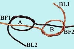 Les 2 noeuds viennent en contact et ne glissent plus. Et pour avoir une liaison moins volumineuse, on peut aussi utiliser 2 noeuds Davy. |