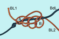 Sur le bas de ligne, à l'endroit où vous voulez mettre la potence, faire un nœud simple A à 2 enroulements. Écarter une des spires pour créer la boucle B. |