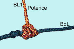 Potence N°1: Pour un bas de ligne à nœuds, le noeud potence viendra s'appuyer sur le noeud du bas de ligne. La potence est solide (95% de la force rupture) et est bien à angle droit du bas de ligne.