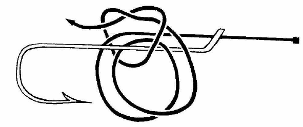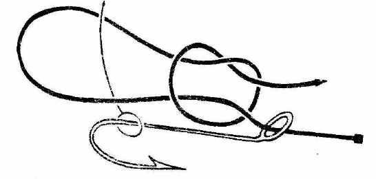 Utilisé avec un certain type d'hameçon dont l'œil est légèrement recourbé, passez le fil dans l'œil, faites le nœud et passez l'hameçon à travers. Serrez le nœud au-dessus de l'hameçon.