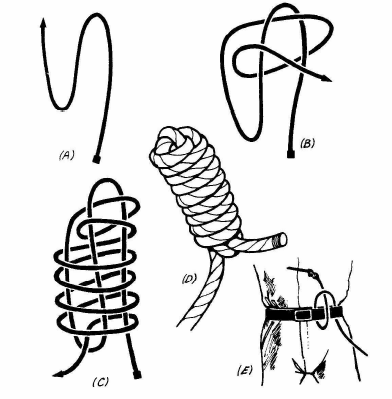 La corde doit mesurer 2 cm environ de diamètre et avoir une longueur de 20 m. Prenez garde à ne pas perdre votre bout de la corde par une fausse manœuvre. Vous pouvez glisser la corde dans votre ceinture et faire une demi-clef (fig. E), mais renoncez s'il existe un risque d'être entraîné au moment du lancer.