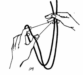 Méthode 1: montrez à ceux qui vous regardent une corde blanche d'environ 2 m. Pliez-la et expliquez que vous devez trouver le milieu exact de la corde; tenez les deux brins en l'air entre le pouce et l'index présentant le dos de votre main au public (car vous allez faire quelque chose derrière cette main qui ne doit pas être vu). Localisez le milieu de la corde alors qu'elle pend devant vous et passez votre pouce et votre index dans la boucle (fig. A). Venez placer cette boucle à côté des deux brins déjà exposés. Mais en fait, avec votre pouce et votre index, vous avez (dans le mouvement) pris la corde en dessous d'un des brins, l'avez pliée et c'est cette boucle que vous montrez (fig. B). Tout est caché derrière la main tenant les brins.