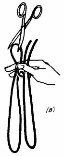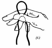Méthode 2: pour faire taire ceux qui s'étonnent que vous teniez votre corde d'une manière aussi étrange, prenez-la directement par le milieu (les deux bouts pendant) et placez-la dans votre main en montrant la boucle. Une fois encore, c'est là une fausse boucle (fig. C), car vous avez eu le temps de plier le petit brin de corde (récupéré auparavant), et c'est cette boucle que vous montrez. Coupez-la, encore quelques tours de passe-passe, et lancez la corde au public pour qu'il puisse l'examiner; pendant ce temps, débarrassez-vous des deux petits brins.