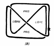 Jetez une petite corde (extrémités nouées) ou une chaîne sur la table et, prestement, arrangez-la pour former un rectangle avec ses diagonales (fig. A-B). Demandez à quelqu'un de placer son doigt dans l'un des quatre triangles; tirez sur la ficelle, si elle glisse autour du doigt c'est gagné pour votre partenaire. Si, en revanche le doigt reste au milieu, c'est vous qui gagnez. Il y a seulement deux triangles dans lesquels le doigt sera pris. Donc chaque parieur a la moitié des chances.