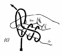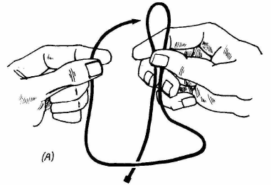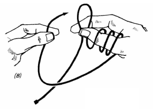 Avec ce tour, vous serez certain de toujours épater votre entourage. Montrez un petit bout de fil plié en boucle entre le pouce et l'index; avec l'autre main, essayez d'enfiler le brin du fil dans cette boucle (fig. A). Expliquez que vous allez passer le fil dans la boucle sans le lâcher bien que la boucle soit trop petite pour laisser passer votre main. Ajoutez que pour que cela soit plus difficile vous allez compliquer un peu. Passez le fil autour de votre pouce avant de faire la boucle (fig. B). Reprenez le fil et après quelques tours de passe-passe, projetez votre main en avant en passant à côté de la boucle. Desserrez vos doigts un moment pour que le fil glisse à l'extrémité de votre pouce et qu'il rentre dans la boucle par en dessous. Le dos de votre main et vos doigts feront écran et, de toute façon, tout va trop vite pour qu'on remarque quelque chose. Ceux qui vous entourent verront le fil passé dans la boucle et encore dans votre main mais ne remarqueront pas que la boucle est à l'envers et qu'il y a un tour de moins sur votre poignet (fig. C).