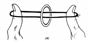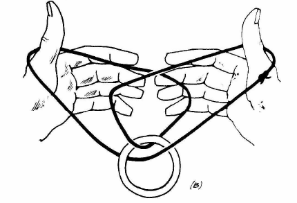 La main est plus rapide que l'œil dans cette manipulation qui demande un peu de pratique. Passez une ficelle, nouée, dans une bague (fig. A). (Une paire de ciseaux ou une clef feront l'affaire). Faites passer la ficelle autour des deux pouces et prenez une ganse avec chaque petit doigt (fig.B). Laissez tomber la boucle de votre petit doigt gauche et celle de votre pouce droit en même temps et séparez rapidement les mains. L'anneau tombe de la corde comme si celle-ci avait été coupée en deux.
