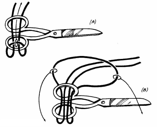 Le problème est de libérer les ciseaux sans toucher aux brins de la ficelle. Tirez sur la ganse, passez-la dans l'autre prise pour les doigts et ensuite au-dessus des ciseaux. Pour tout autre objet, il faut toujours faire passer la ganse au-dessus de l'objet.