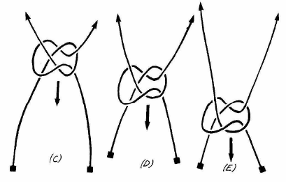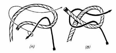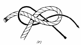 Ce nœud (fig. A-B) est une combinaison du nœud de voleur et du nœud de ménagère; ainsi il glisse et ne tient pas, II est réalisé avec deux fils lisses et flexibles, et on peut le faire glisser aisément (fig. C-E). C'est encore mieux si vous utilisez deux fils de couleur différente. Surveillez les deux brins qui viennent du dessous du nœud. S'ils bougent (fig. F), le nœud se coince et vous échouez.