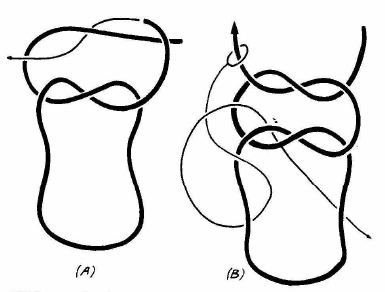 Faites un nœud plat très lâche (fig. A), passez un brin à l'intérieur (fig. B) pour le "renforcer". Laissez-le lâche. Bien qu'il paraisse compliqué, en tirant sur les brins il disparaîtra.