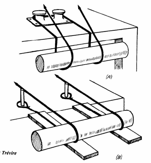 Cette technique est plus facile à utiliser avec des objets ronds car il n'y a pas de friction: les objets roulent avec le mouvement de la corde. Une seule corde suffit pour des objets pas trop longs (fig. A); dans les autres cas, il faudra plusieurs cordes (fig. B). Veillez à tirer en même temps et de la même façon des deux côtés.