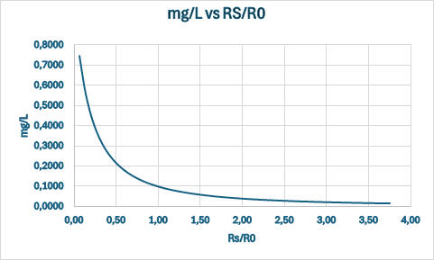 R0 = Rs in a clean air environment Rs/R0 = 1 mg/L = 0 Since R0 is the sensor's resistance in clean air, then by definition, in clean air, Rs = R0, giving a ratio of Rs/R0 = 1. Using the standard formula: mg/L = a x (Rs/R0)^b We observe that instead of displaying 0 mg/L, the sensor returns the value of the constant a. Applying the offset correction To correct this behavior and force the curve to pass through the origin (1,0) in the resistance ratio coordinate system, we subtract the offset value from the entire equation. This compensates for the sensor's basic reading in an environment without a target gas. mg/L = a x (Rs/R0)^b - a Adjusting the formula to mg/L = a x (Rs/R0)^b - a is a necessary calibration technique when R0 is measured in pure air. This subtraction of the offset a ensures that the calculated concentration is 0 mg/L when the ratio equals 1, thus improving the accuracy of measurements at low concentrations. |