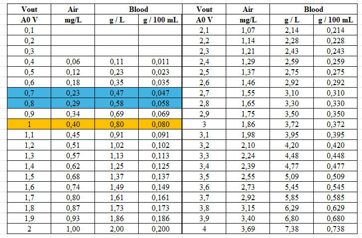 Sensitivity compression: Although the manufacturer often suggests 10kΩ for detecting minute traces (up to 10 mg/L at the theoretical detection limit), such a value would saturate almost immediately if blown directly onto it. Breath adaptation: Lowering the sensitivity to 1kΩ reduces the overall sensitivity. This allows the device to "zoom" in on the 0.05–4 mg/L range, which is ideal since the legal limit (e.g., 0.25 mg/L of exhaled air in France) falls precisely within this stable measurement range. Resolution: At 1kΩ, the voltage variation between a sober subject and a subject who has consumed alcohol is spread more evenly across the 0–5V scale, making it easier for a microcontroller like an Arduino to read the reading. With a 1kΩ load resistor, the output voltage of the MQ-3 is typically calibrated to a range of 0 to 4V to cover breath alcohol concentrations. This configuration is particularly effective because it provides a safety margin before signal saturation (at 5V), thus preventing data clipping during concentration peaks or highly concentrated breath samples. Why stop at 4V? Limiting the usable range to 4V, rather than using the full range as previously stated, offers two major technical advantages: Relative linearity: The sensor's response is logarithmic. By remaining below 5V, we avoid the region where the sensitivity curve flattens completely, resulting in more accurate digital conversion. Signal protection: This allows detection of over-concentration or parasitic voltage spikes without losing the actual reading of the maximum value. |