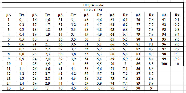 Exemple pour une résistance de 1k,10K, 100k etc., ajustez pour une pleine lecture de l'ampèremètre (100 pour un 100 µA)