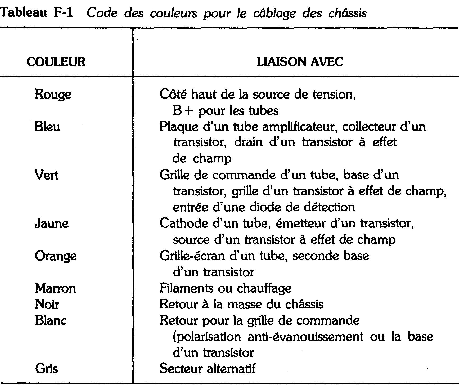Les couleurs des fils des circuits électroniques suivent généralement le tableau F-1.