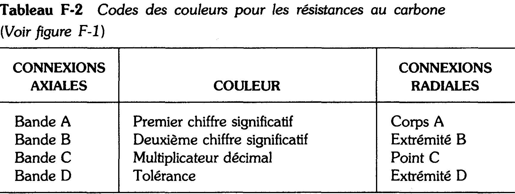 Pour les puissances nominales inférieures ou égales à 2 W, les résistances au carbone sont codées soit par des bandes de couleurs, soit par le système extrémités-corps-point, comme on l'indique au tableau F-2.