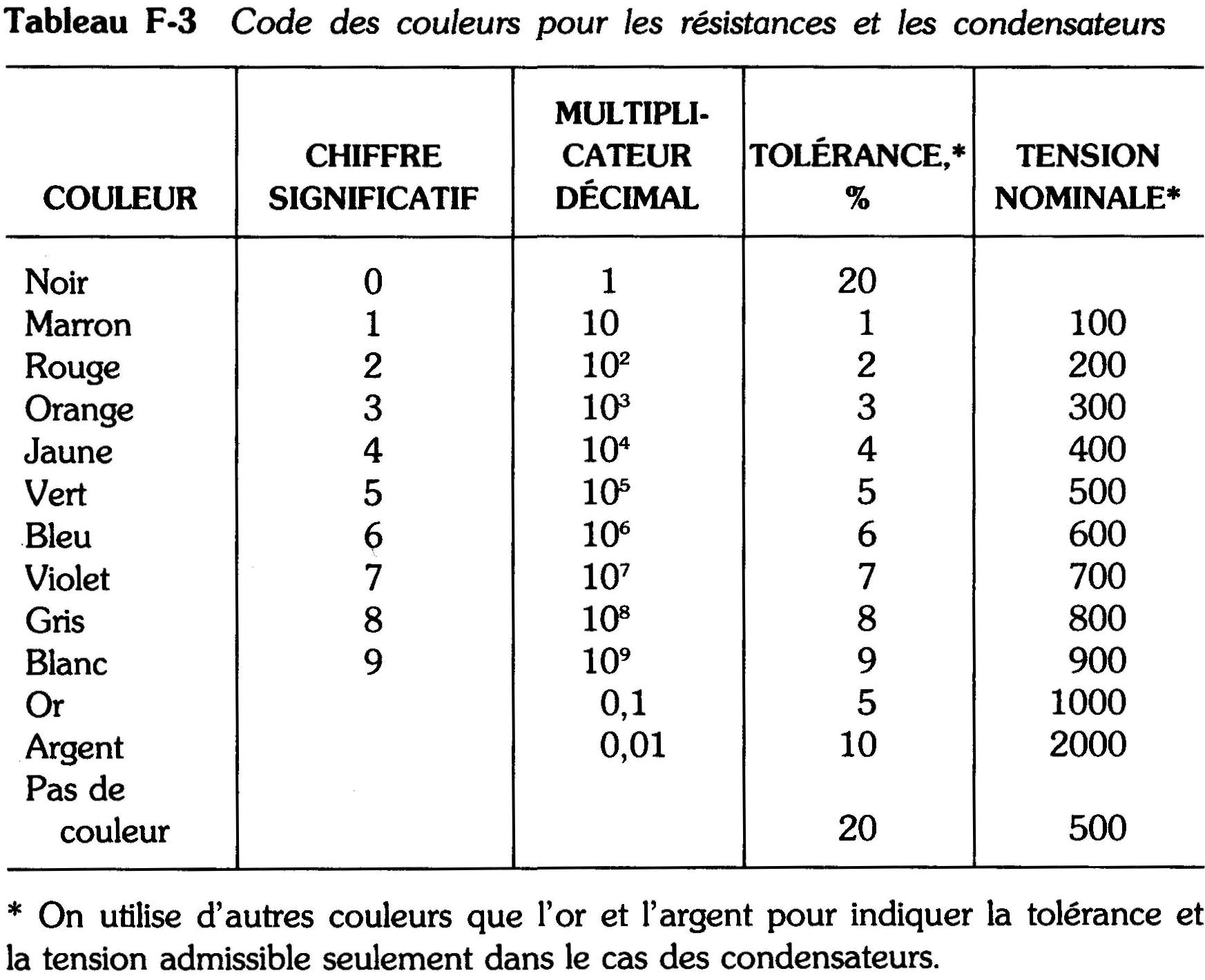 Les couleurs indiquées au tableau F-3 s'appliquent à la fois aux résistances et aux condensateurs. Cependant, les couleurs indiquant la tension nominale ne s'appliquent qu'aux condensateurs.