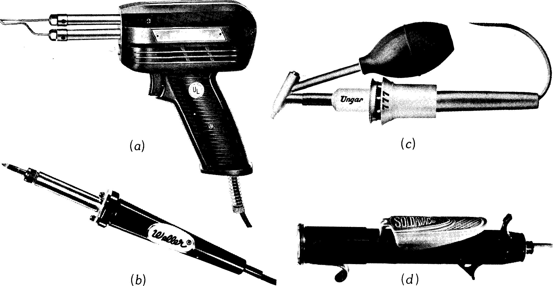 Figure G-2 (a) Pistolet à souder; (b) fer à souder à pointe fine; (c) fer à dessouder; (d) outil à dessouder Soldavac.