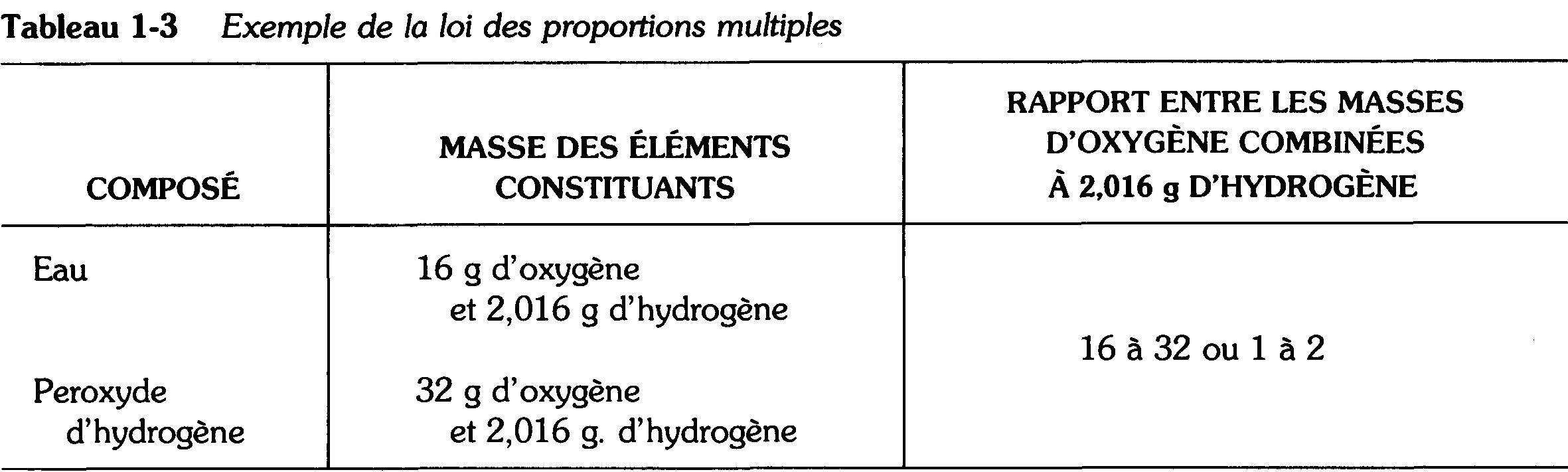 L'eau et le peroxyde d'hydrogène constituent une autre application de cette loi. La relation entre les masses d'oxygène et d'hydrogène que l'on retrouve dans ces composés est indiquée au tableau 1-3.