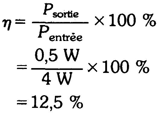 Calculer le rendement d'un récepteur de radio exigeant une puissance d'entrée de 4 W pour fournir une puissance de sortie de 0,5 W.