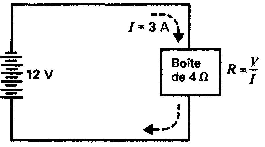 pour obtenir la valeur en ampères du courant traversant R, il suffit de diviser la tension (différence de potentiel) en volts appliquée aux bornes de R par la résistance en ohms de R.