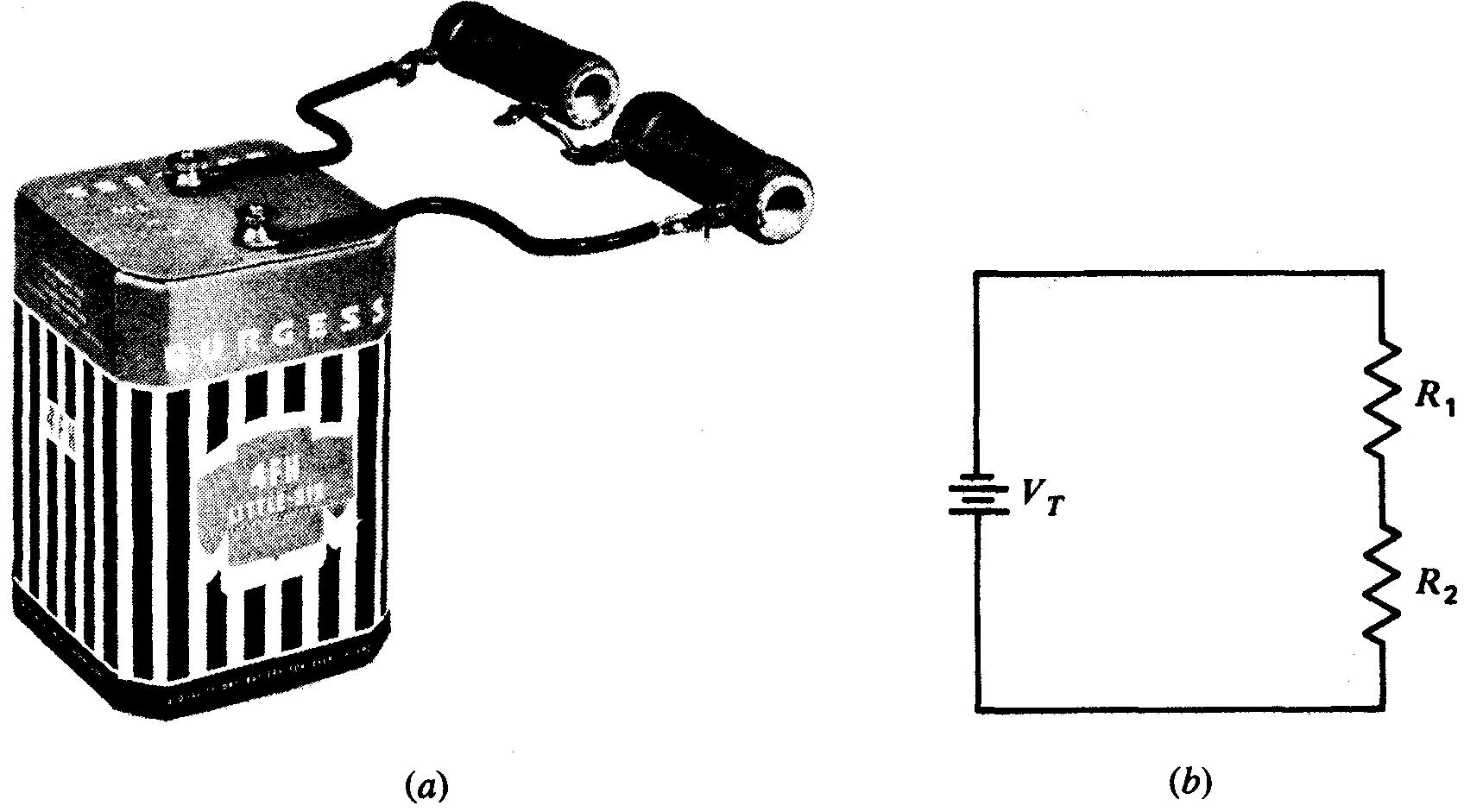 Quand les composants d'un circuit sont connectés par ordre successif, une extrémité de l'un étant reliée à une extrémité du suivant comme l'indique la figure 3-1, ils forment un circuit série.