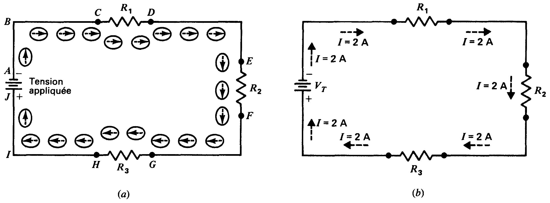 Sur la figure 3-2, la pile fournit la différence de potentiel qui force les électrons à se déplacer, de la borne négative A vers B, en suivant les fils de connexion et les résistances R1, R2 et R3, et à revenir à la borne positive J de la pile.