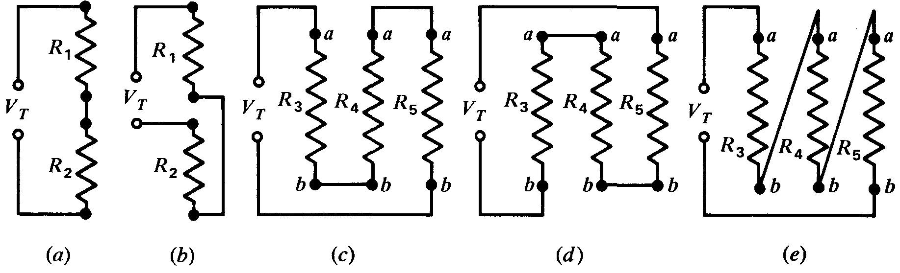 Figure 3-3 Montages série: R1 et R2 sont en série en (a) et (b); R3, R4 et R5 sont en série en (c), (d) et (e).