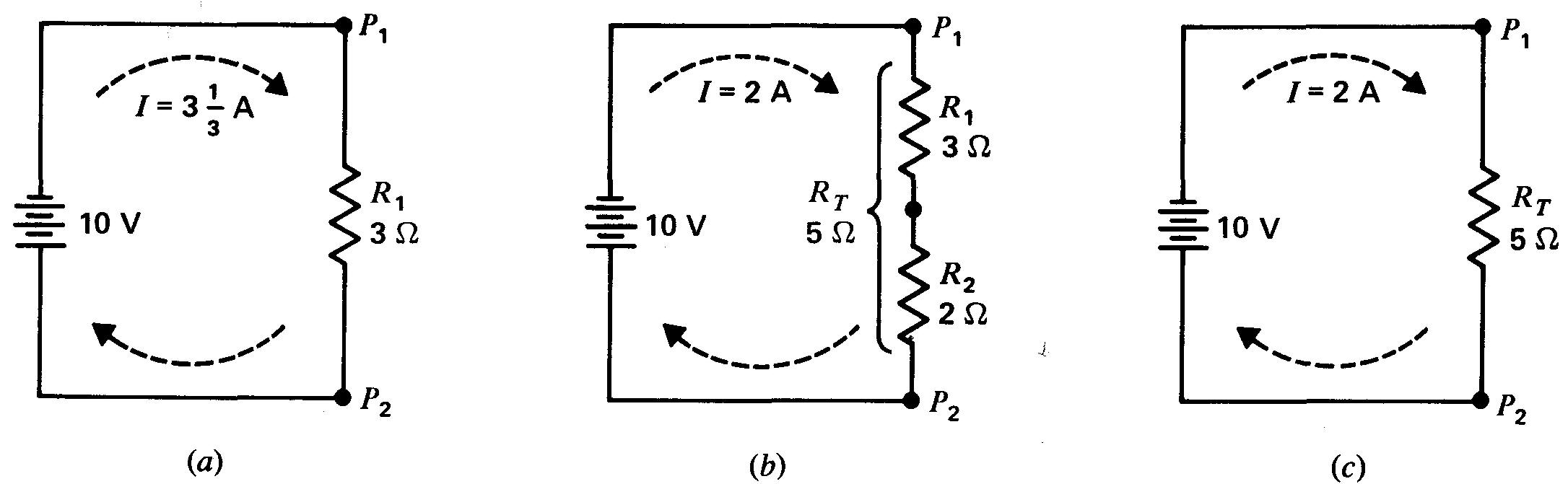 Figure 3-4 Des résistances en série s'additionnent: (a) la résistance R1 seule est de 3 Ω; (b) R1 et R2 en série font un total de 5 Ω (c) la résistance totale RT entre P1 et P2 est équivalente à une seule résistance de 5 Ω entre P1 et P2.