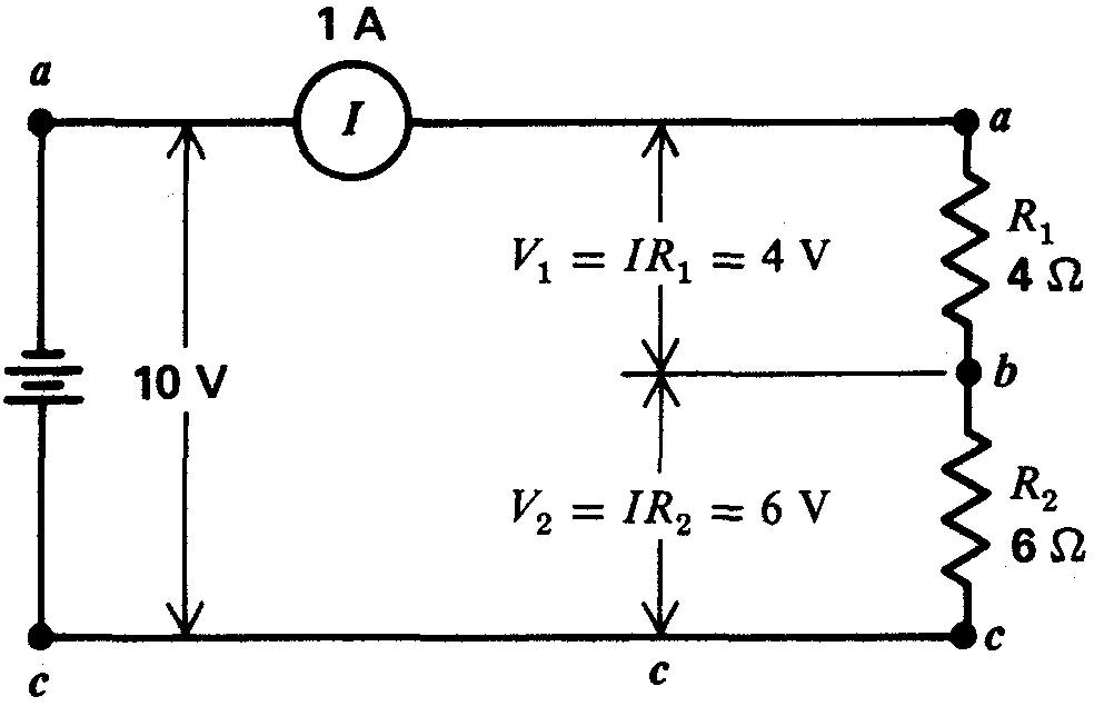 Dans ce cas, un courant de 1 A traverse les résistances en série R1 de 4Ω et R2 de 6 Ω. La résistance totale RT de 10 Ω est placée entre les bornes de la tension de 10 V appliquée.