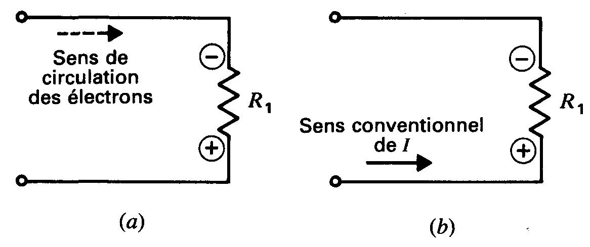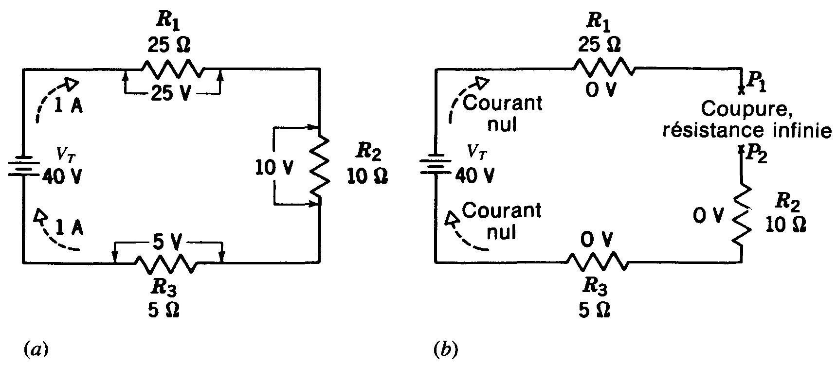 Sur la figure 3-4, par exemple, 10 V sont appliqués, entre les points P1 et P2, aux bornes de 5 Ω, en (b) et (c) pour créer un courant de 2 A. Ce courant traverse R1 et R2.
