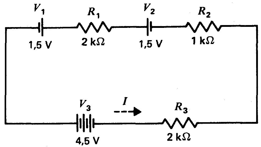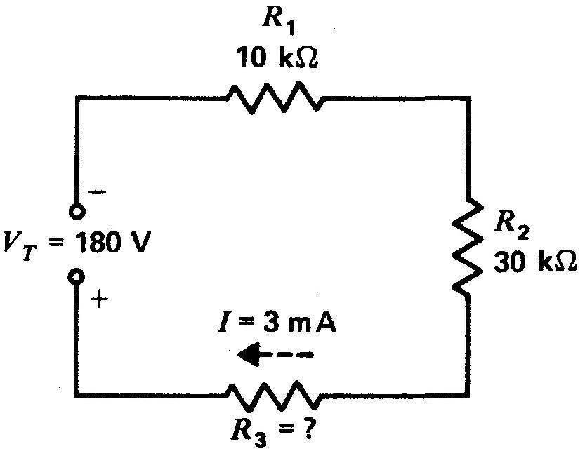 9. Tracer le schéma de trois résistances égales montées en série aux bornes d'une source de 90 V, chaque résistance ayant à ses bornes le tiers de la tension appliquée, dans le cas où le courant du circuit est de 2 mA.