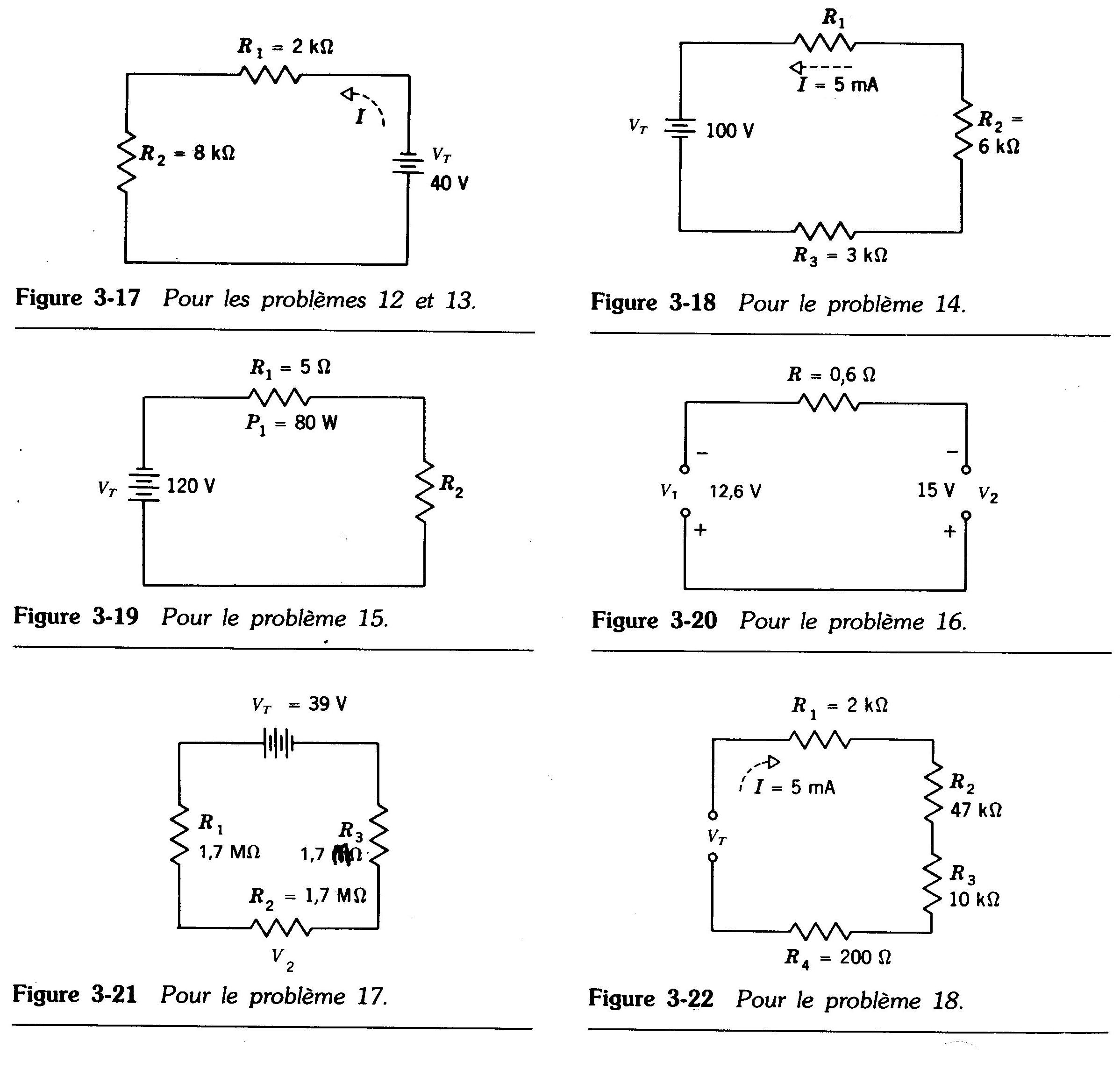 12. Considérer la figure 3-17 et calculer I, V1, V2, P1, P2, et PT.