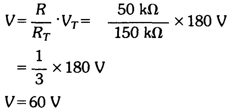 Trois résistances R1, R2 et R3 de 50 kΩ sont disposées en série aux bornes d'une source de tension de 180 V.