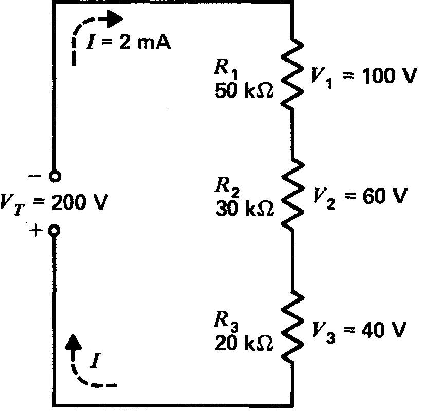 6. Dans le diviseur de tension série de la figure 6-1, la tension V1 est égale à 2,5 fois V3 du fait que R1 est égal à 2,5 fois R3.