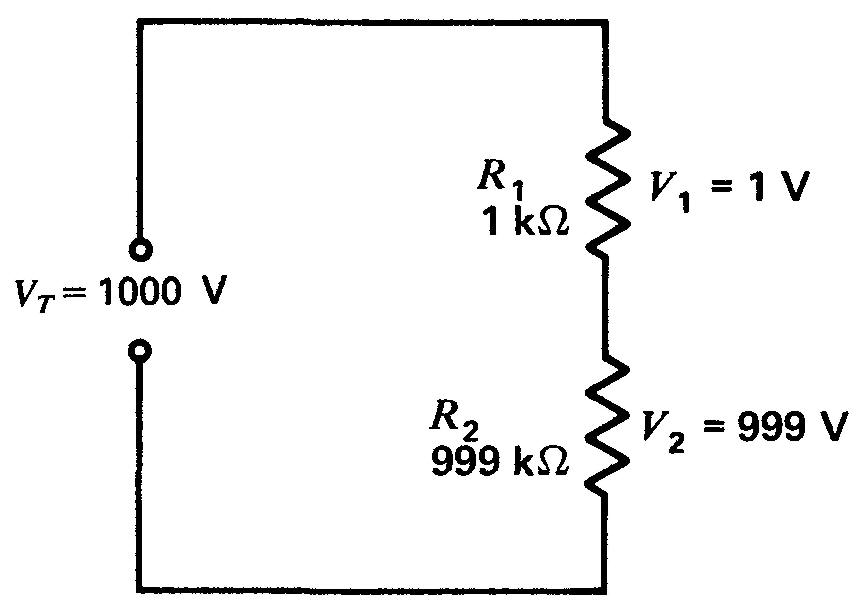 La figure 6-2 illustre un cas de ce genre: les résistances R1 de 1 kΩ et R2 de 999 kΩ sont en série et la tension VT est de 1000 V.