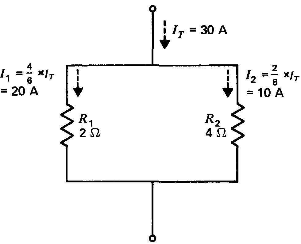 Ainsi, à la figure 6-3, le courant I1 de 20 A est le double du courant I2 de 10 A, car la résistance R1 de 2Ω est la moitié de la résistance R2 de 4Ω. Le courant divisé I est donc inversement proportionnel à la résistance R qu'il traverse.