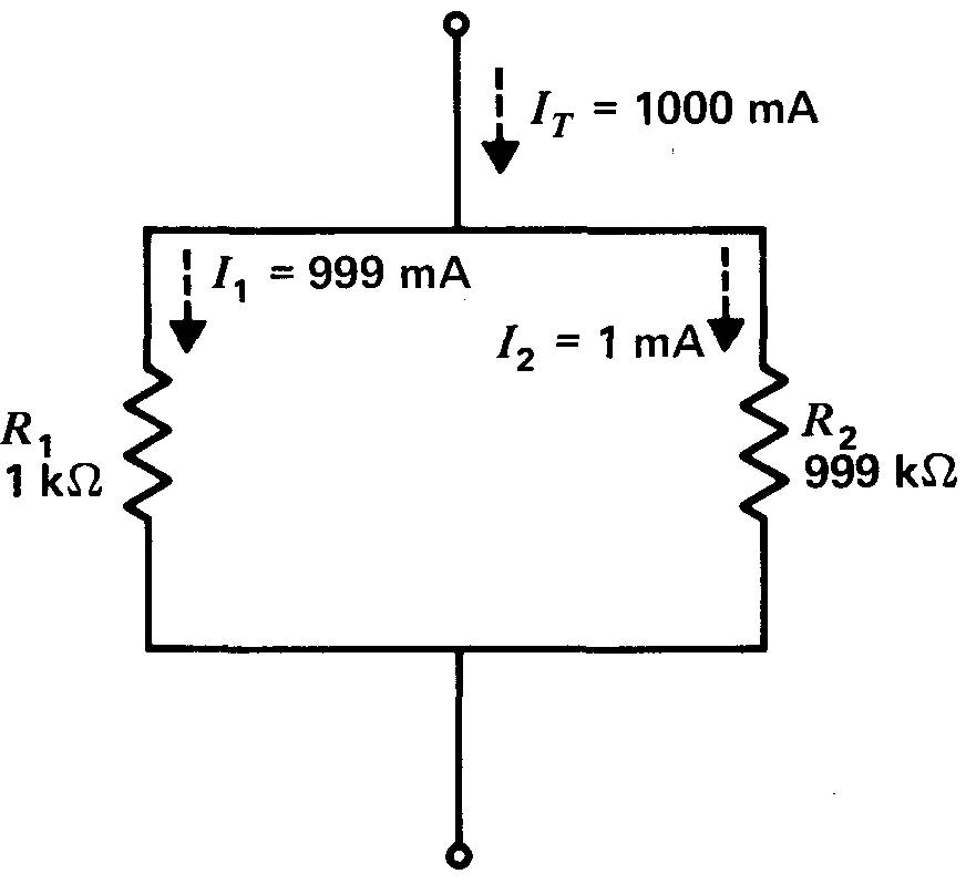 Cette caractéristique du réseau parallèle, le courant I divisé inversement proportionnel à la résistance R qu'il traverse, entraîne qu'une très grande résistance R a peu d'effet sur une résistance R beaucoup plus petite disposée en parallèle.