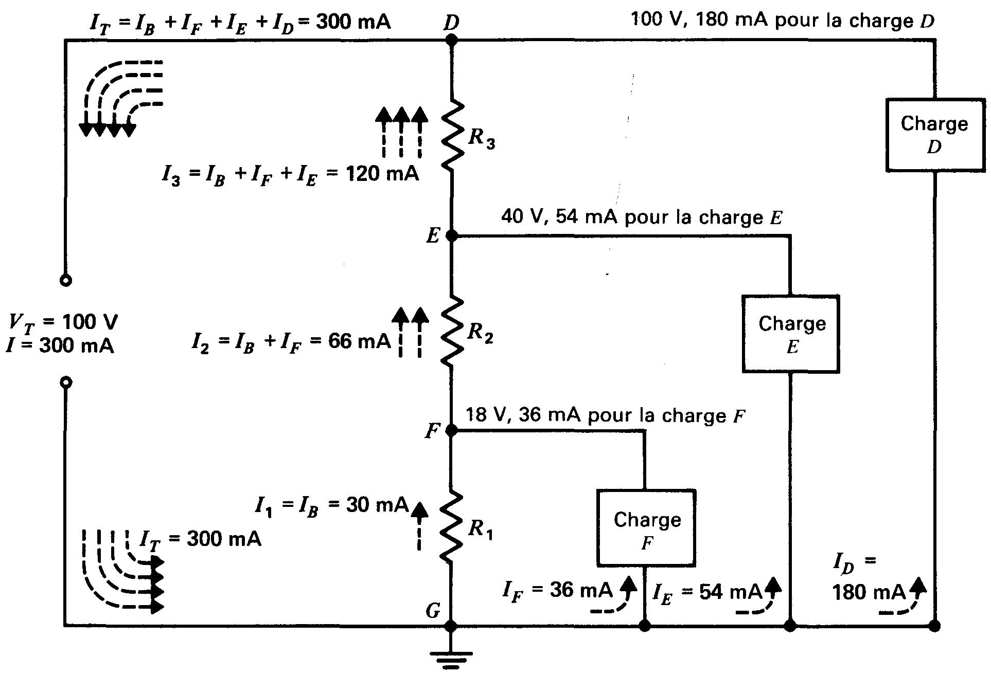 Le courant IE de 54 mA circulant dans la charge E revient à la source via R3 seul. Cette résistance J?3 est aussi parcourue par le courant IF de 36 mA et par le courant IB de 30 mA.