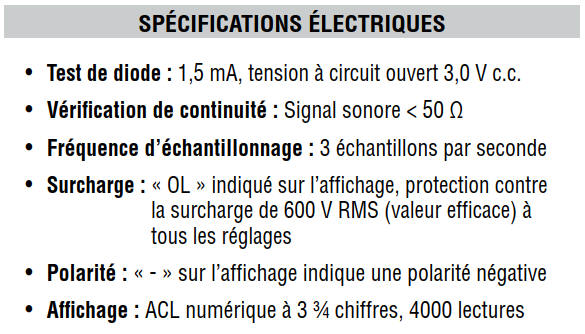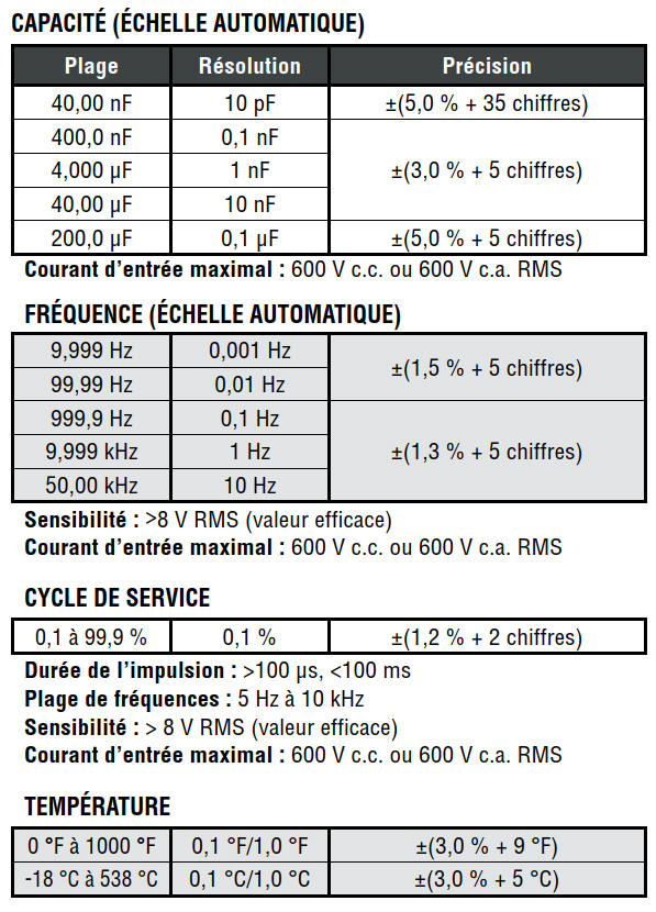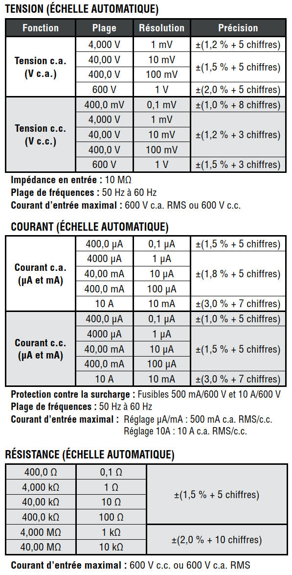 Par exemple, une précision de ±(2 % + 2) signifie qu'une mesure de 100,0 V sur le multimètre peut varier de 97,8 V à 102,2 V.