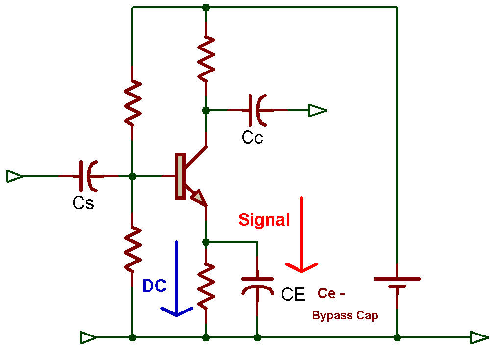 Ce condensateur est connecté en parallèle à la résistance de l'émetteur, créant un chemin à faible impédance vers la terre pour les signaux AC. Cette configuration contourne la résistance de l'émetteur pour les signaux AC tout en maintenant les conditions de biais CC inchangées.