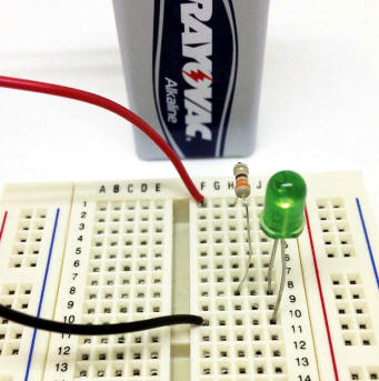 Comme dans le « Projet n° 8 : Alimentation d'une LED », ce circuit allume une LED, mais cette fois, nous le monterons sur une plaque d'essai.