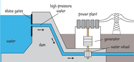 La centrale laisse simplement l'eau circuler dans une roue reliée à un générateur. Cette électricité est ensuite transférée, par des lignes électriques, aux prises électriques des habitations.