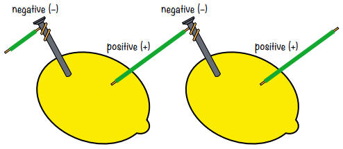 Pour connecter deux citrons en série, il suffit de relier le pôle positif de l'un au pôle négatif de l'autre.