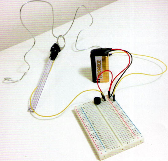Connectez le fil d'acier au breadboard à l'aide du fil de connexion libre relié à la borne négative de la batterie et d'un morceau de ruban adhésif, comme illustré sur la figure 1-2.