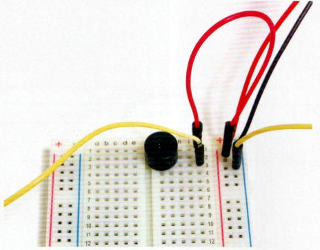 Il suffit de connecter le buzzer et la pile, à l'aide des repères noirs du schéma, à la plaque d'essai.