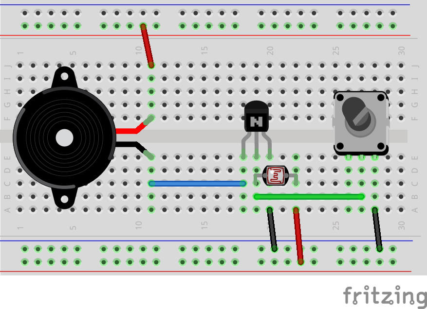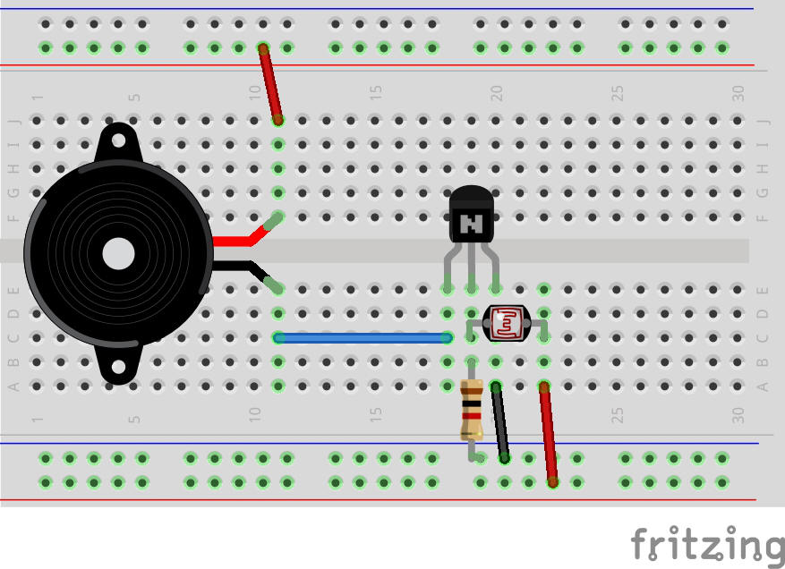 C'est plus que les 0,7 V nécessaires pour que le courant circule de la base à l'émetteur, donc le transistor s'active, permettant au courant de circuler à travers le buzzer, le collecteur et l'émetteur et déclenchant l'alarme.