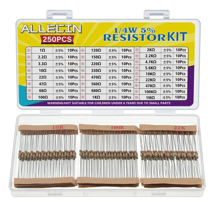 Certains magasins proposent un pack varié contenant 500 résistances de 1/4 W assorties avec une tolérance de 5 % et incluant toutes les valeurs indiquées ci-dessous.