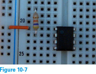 Au lieu d'utiliser deux résistances et un condensateur pour réguler la tension de sortie de la puce 555, comme dans le projet 9, vous utilisez une seule résistance, une photorésistance et un condensateur.