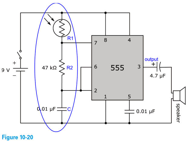 De même, là où le projet 8 utilise deux résistances et un condensateur pour contrôler la durée de l’alternance de tension sur la broche 3, ce circuit utilise une résistance, une photorésistance et un condensateur pour contrôler cette durée.